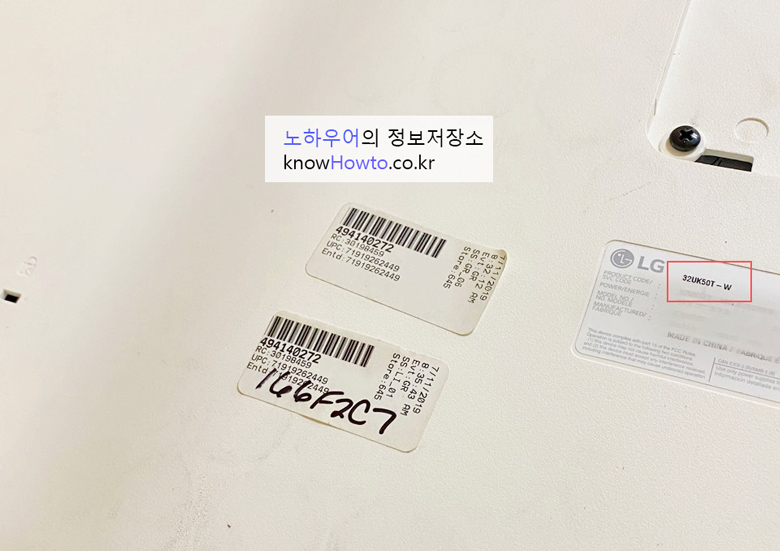 제품에 스티커가 몇 개 붙어있고, 모델명은 32UK50T-W 라고 적혀있네요.
