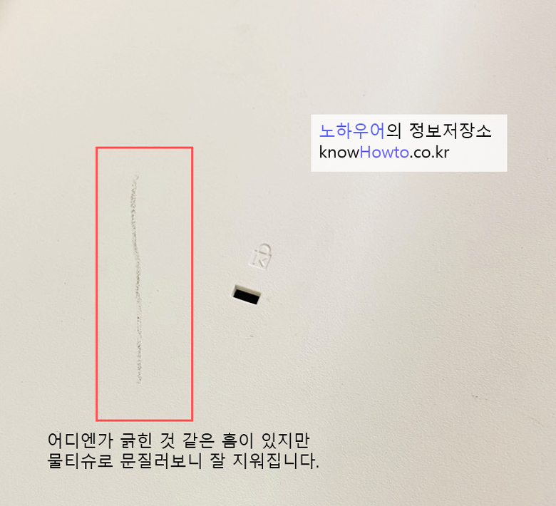 어디엔가 긁힌 것 같은 흠이 있지만 물티슈로 문질러보니 잘 지워집니다.