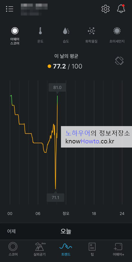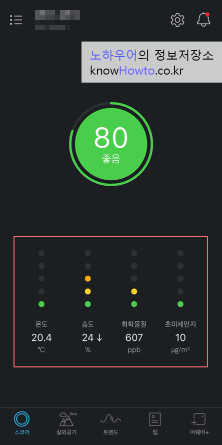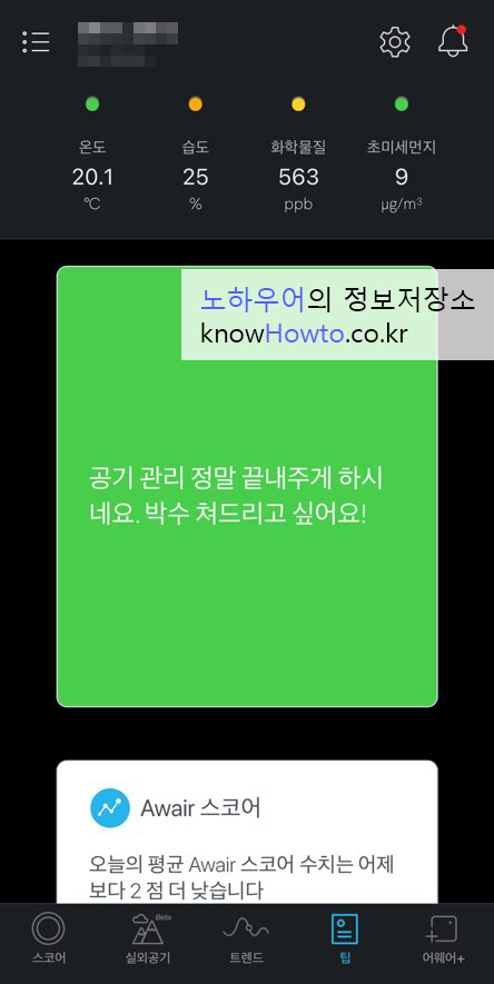 어웨어의 스마트폰 앱이 꾸준히 저에게 알람을 주어 (공기질이 좋다 나쁘다)