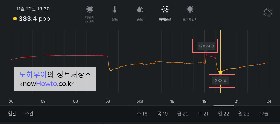 위 화면을 보시면 화학물질 수치가 (상단 메뉴 중 4번째) 오전 8시경 최고점을 찍고 9시 넘어서 떨어졌네요.