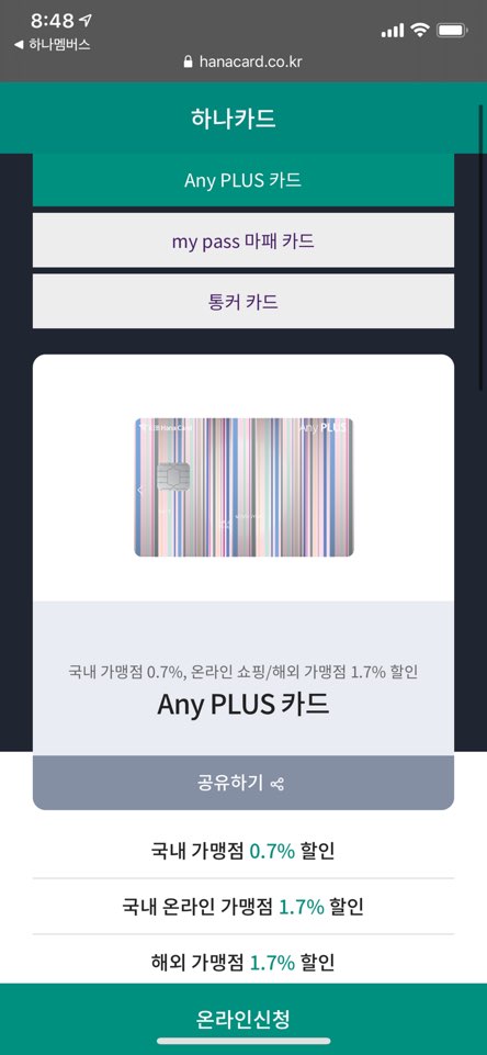 전월실적 조건도 없고, 온라인 소비는 1.7%를 할인해주는 애니플러스 카드를 신청했습니다 ^^