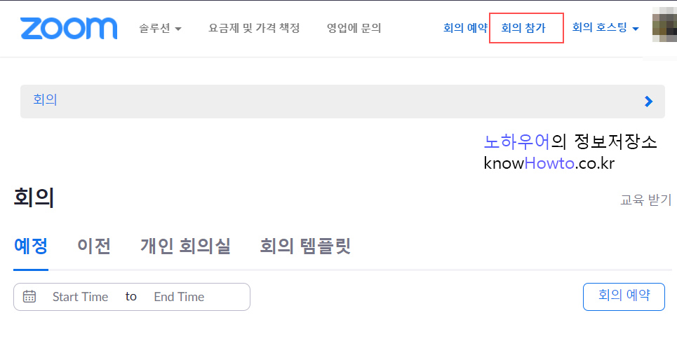 우측 상단에 보시면 회의 참가 버튼이 있습니다.