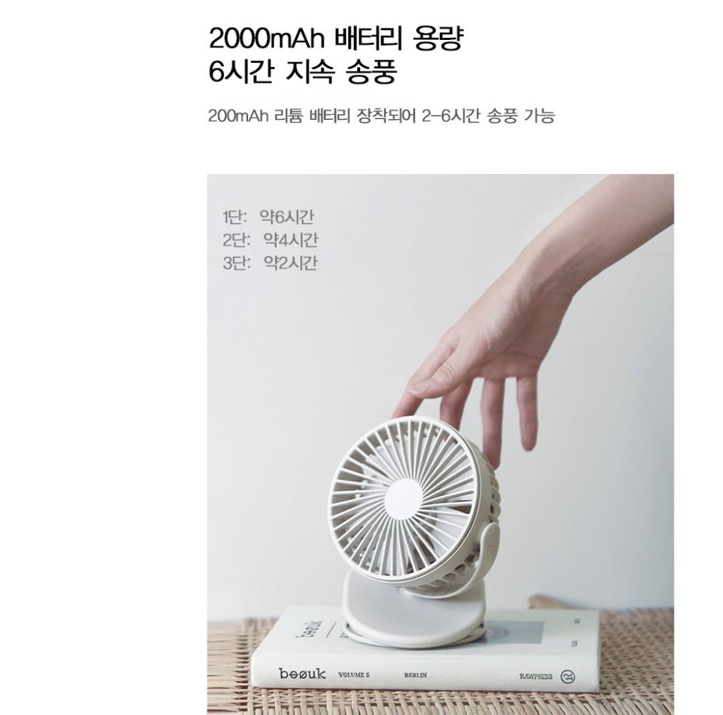 샤오미 Solove F3 클립형 무선선풍기는 2000mAh의 배터리 용량을 제공합니다.