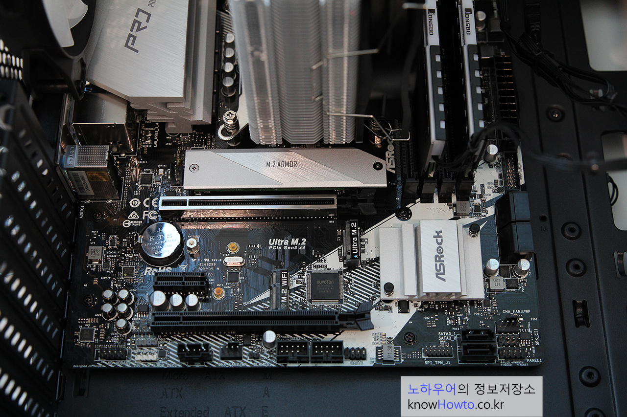보드와 CPU, CPU쿨러와 NVMe SSD, RAM과 메모리방열판을 설치한 모습니다.