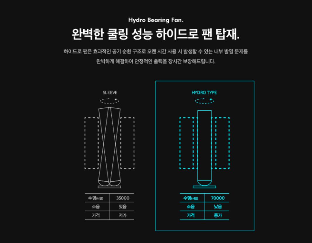 그리고, 팬은 6개 모두 하이드로 팬(Hydro Fan)으로 소음은 적고 수명은 더 깁니다.