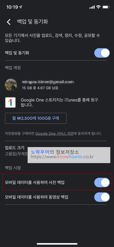 4. '모바일 데이터를 사용하여 사진 백업' 옵션을 켭니다.