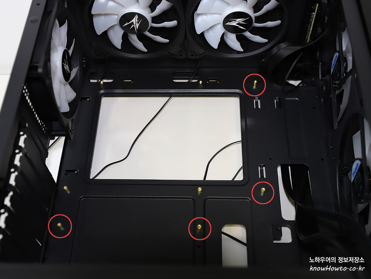 m-ATX 타입으로 위 사진과 같이 메인보드 받침대를 몇 개는 옮기고 몇 개는 추가로 설치해 주어야 합니다.
