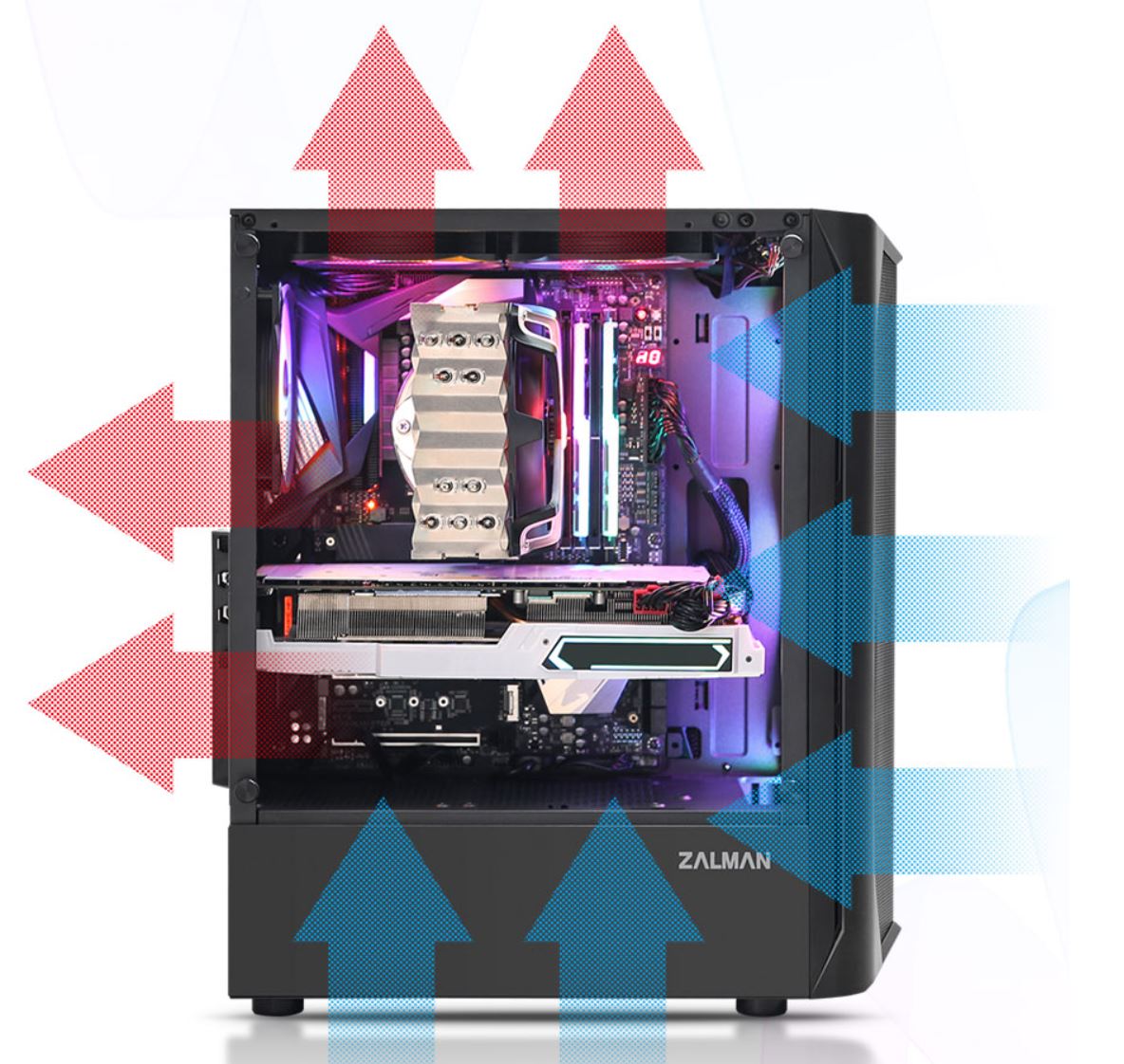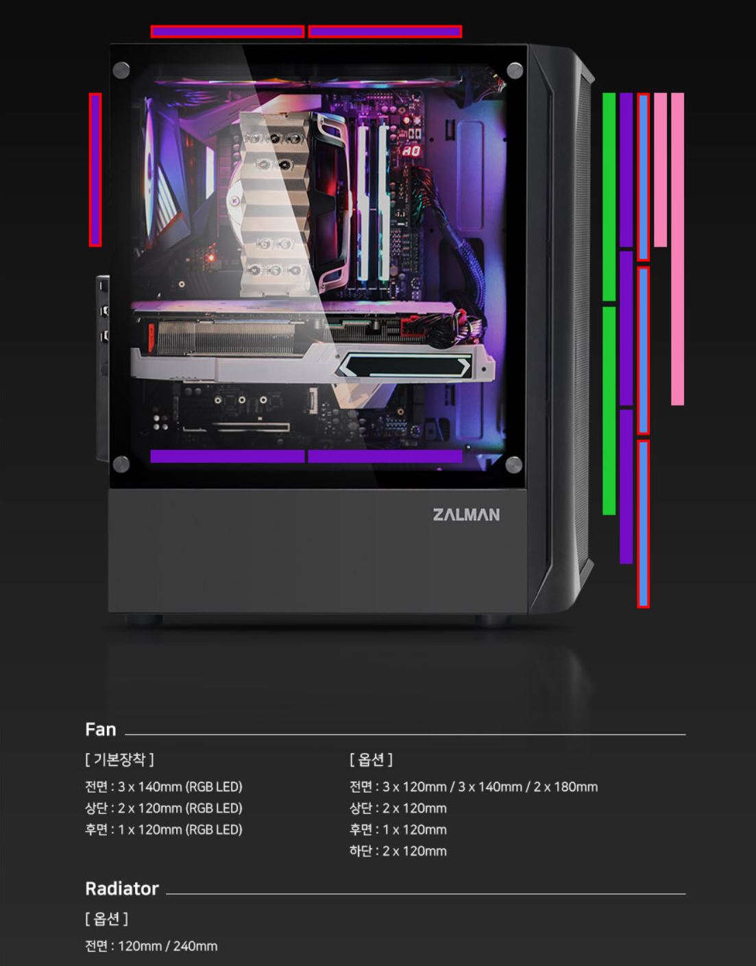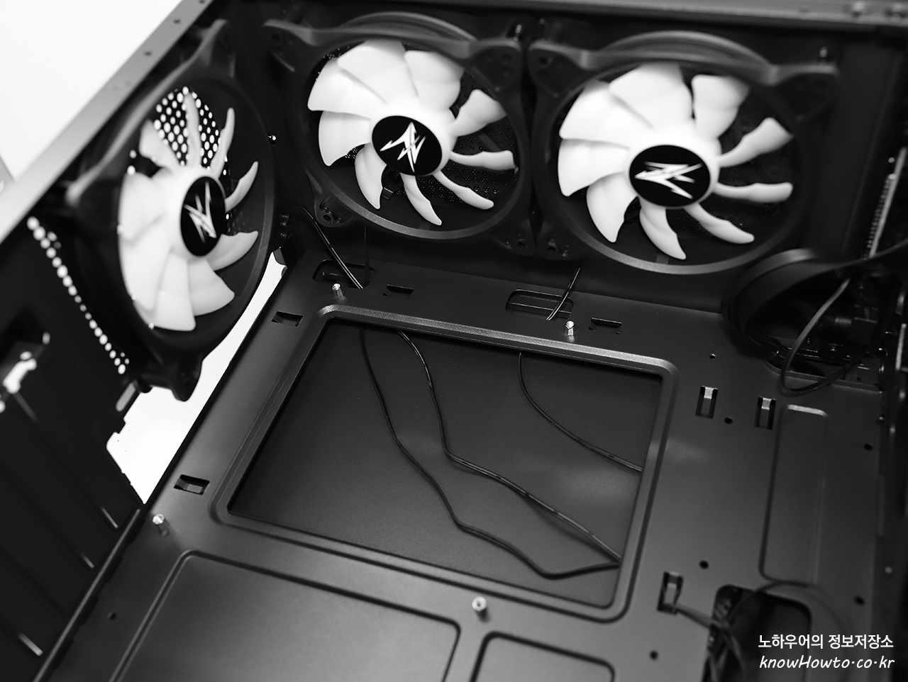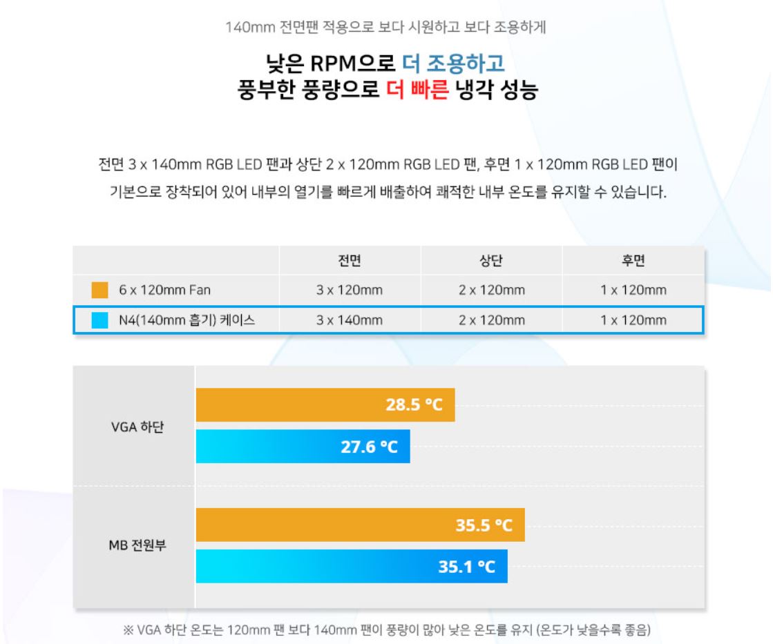 특히 전면팬 3개는 일반 팬 크기인 120mm가 아니라 140mm 팬 3개로 강력한 풍량을 제공합니다.