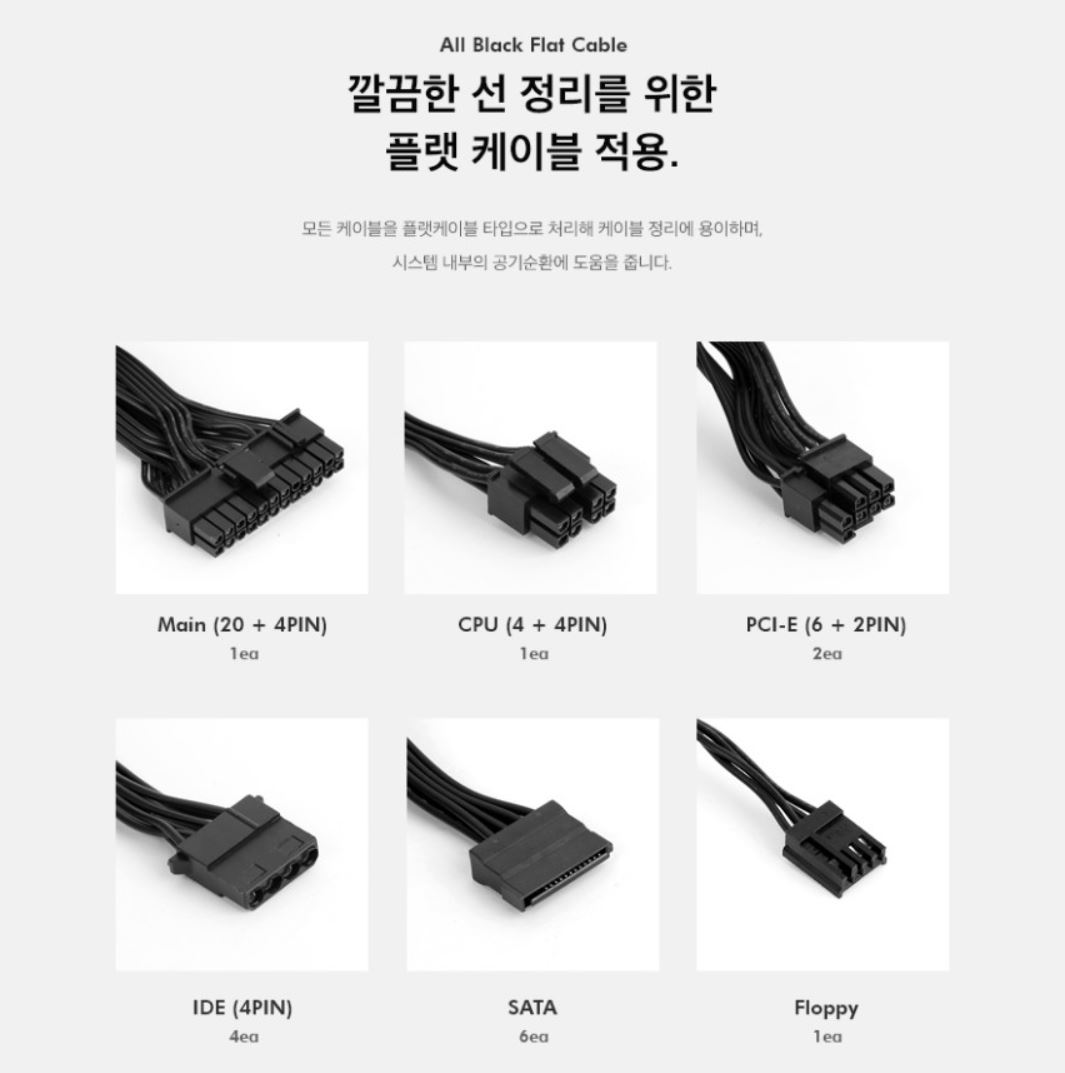 메인보드 파워케이블, CPU 케이블, PCI-E케이블, IDE케이블, SATA케이블, 플로피디스크 케이블까지 제공합니다.