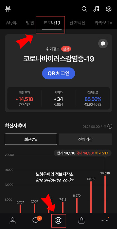 3. 위 사진의 상단에 있는 '코로나19' 탭을 클릭합니다.