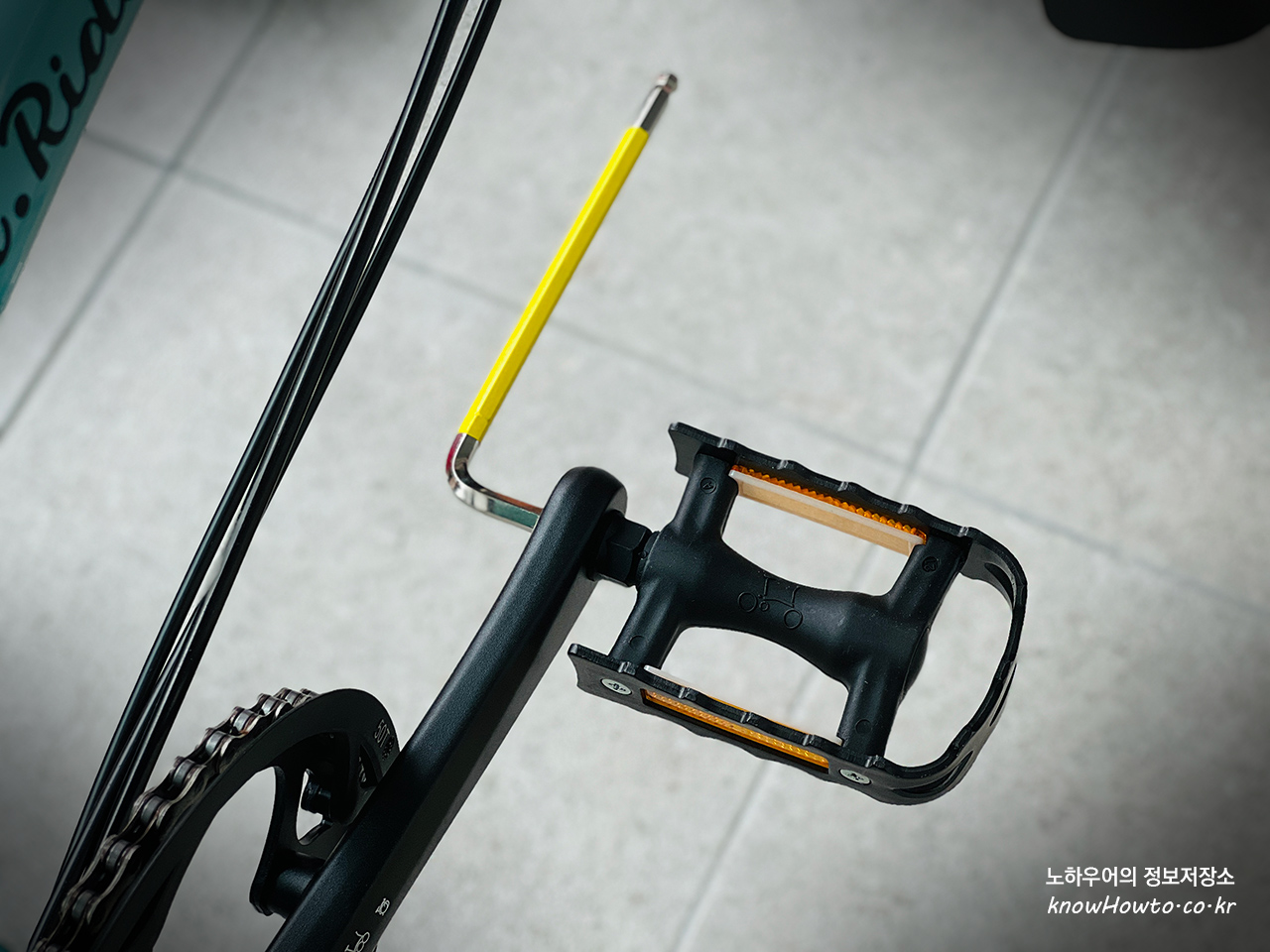 육각렌치를 구입 & 준비하셨으면 육각렌치를 자전거 페달 반대편에 아래 사진과 같이 끼워줍니다.