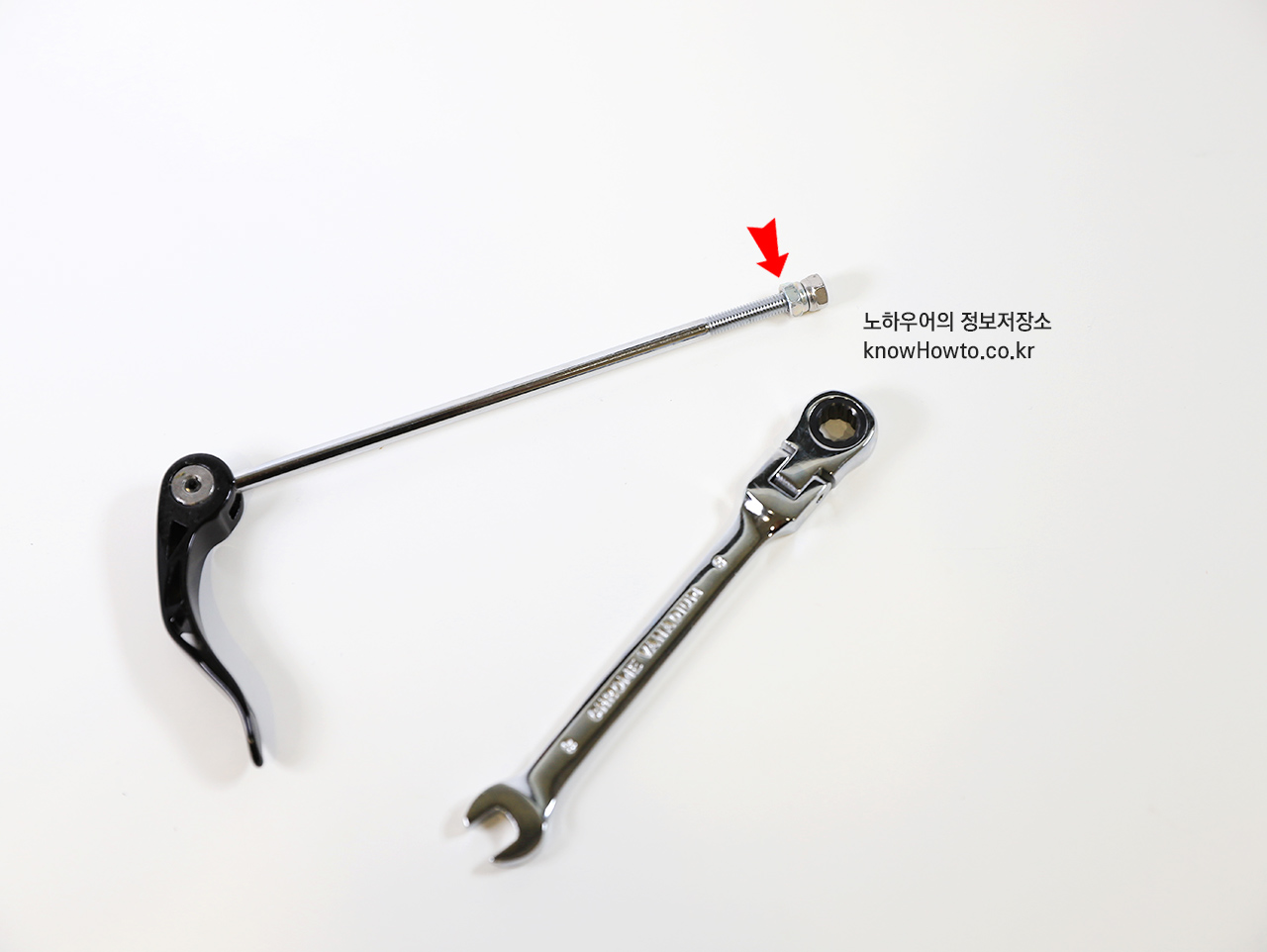 3. 안쪽 너트를 렌치로 물고, QR레버와 반대방향으로 QR엑슬이 풀리도록 돌립니다.