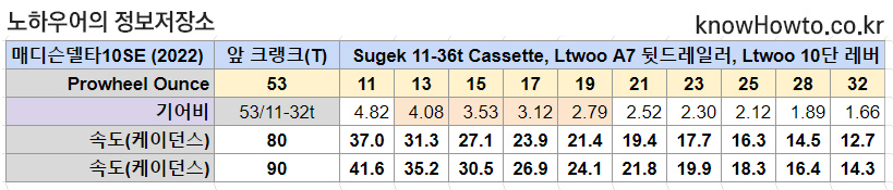 케이던스 80일때 10단으로 37km/h의 속도를, 케이던스 90으로는 41.6km/h의 속도를 낼 수 있습니다.