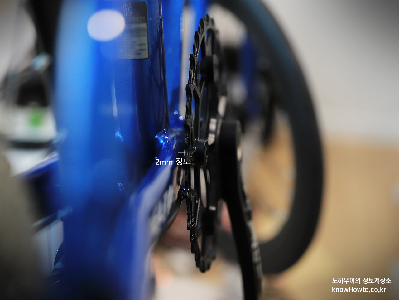 아래 사진을 보시면 체인링과 프레임사이에 약 2mm의 간격이 남아서 클리어런스가 확보되었습니다.