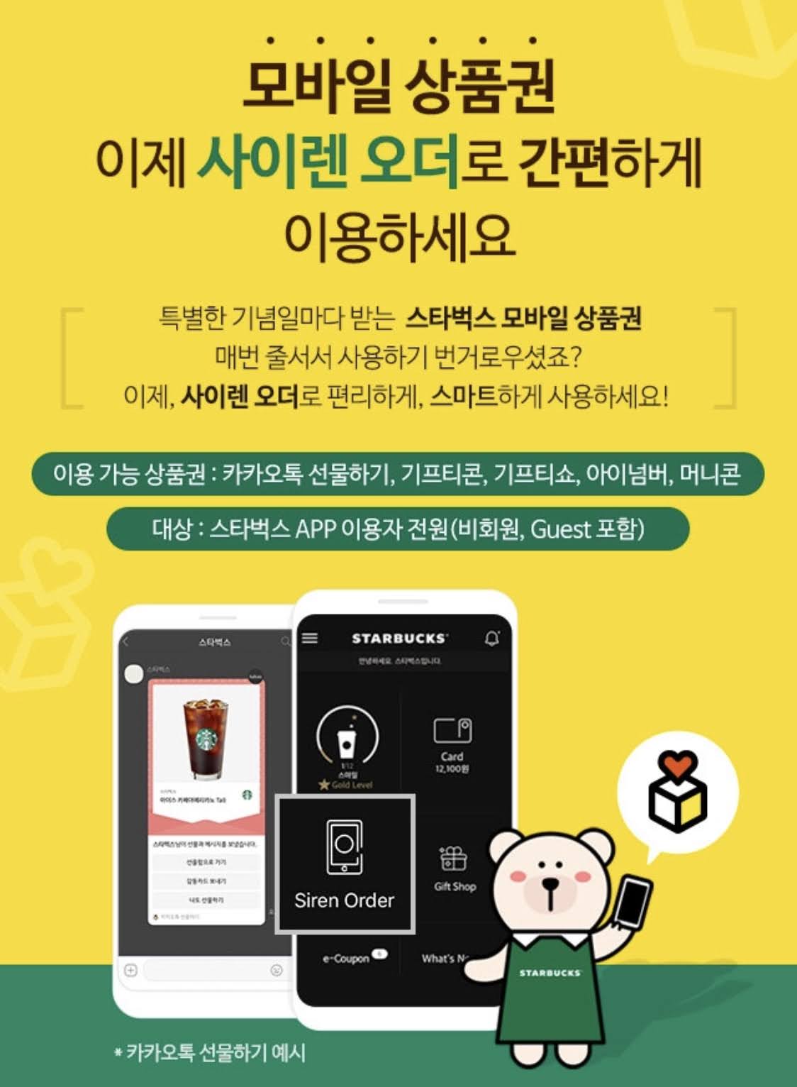 하지만 이제 아래 모든 상품권들이 사이렌오더 주문시 이용 가능합니다!