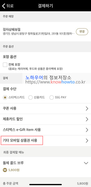 아래 화면에서 '기타 모바일 상품권 사용'을 선택합니다.
