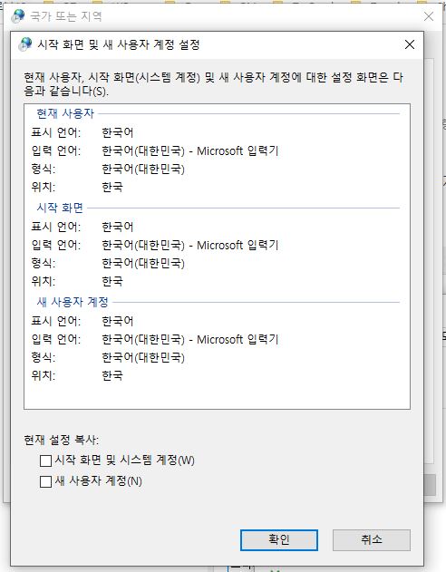 4. '설정 복사'를 누르고, '시작화면 및 시스템 계정'과 '새 사용자 계정' 모두 체크한 뒤 '확인'.