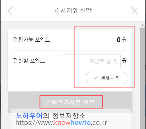 4. 아래와 같은 팝업창에서 원하는 전환금액을 넣고 '스마일캐시로 전환' 버튼을 클릭합니다.