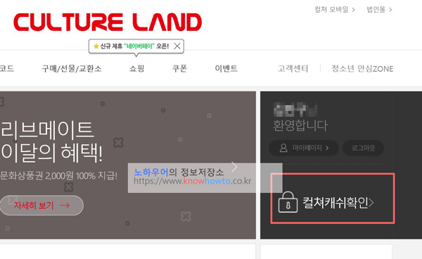 우측에 내 이름 아래에 '컬쳐캐쉬확인' 메뉴를 클릭합니다.