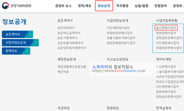 3. 위와 같은 세부메뉴가 나오면 정보공개 > 사업자 등록현황 > 통신판매업자 를 선택합니다.