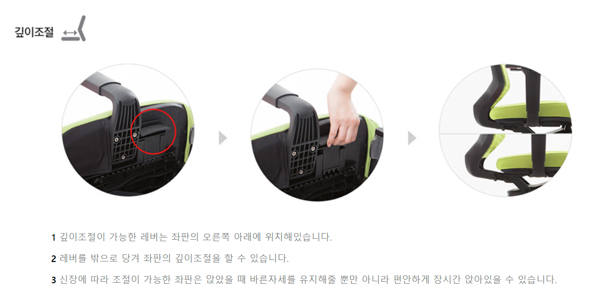 좌판을 앞뒤로 움직이는 기능은 보통 고급형 의자에서만 지원됩니다.