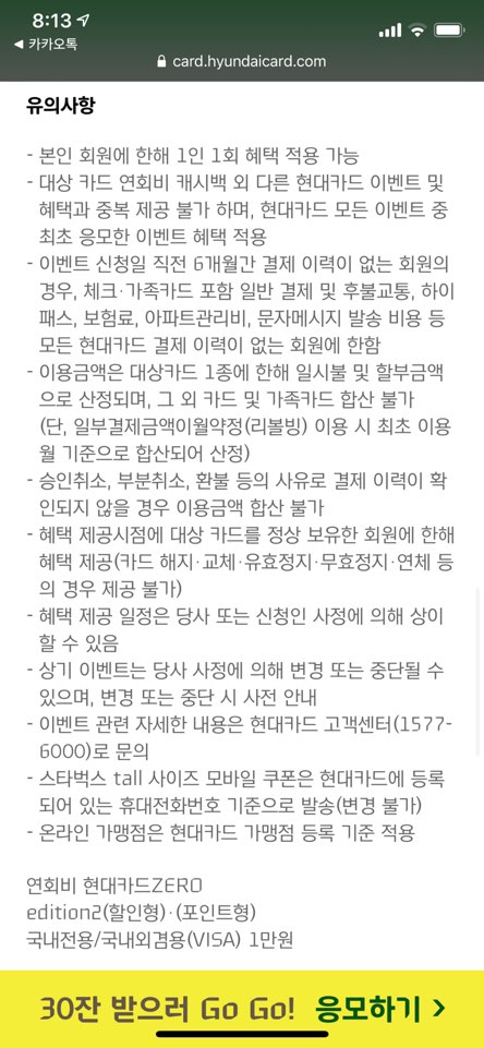위와 같이 현대카드 제로2를 발급하면 스타벅스 기프티콘 30장을 주는 이벤트입니다.