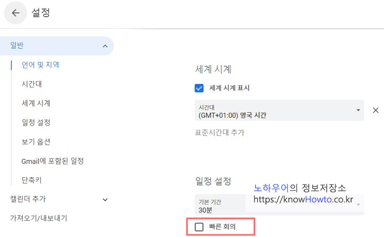 구글캘린더 설정에 보면 '빠른 회의'라는 메뉴가 있습니다.
