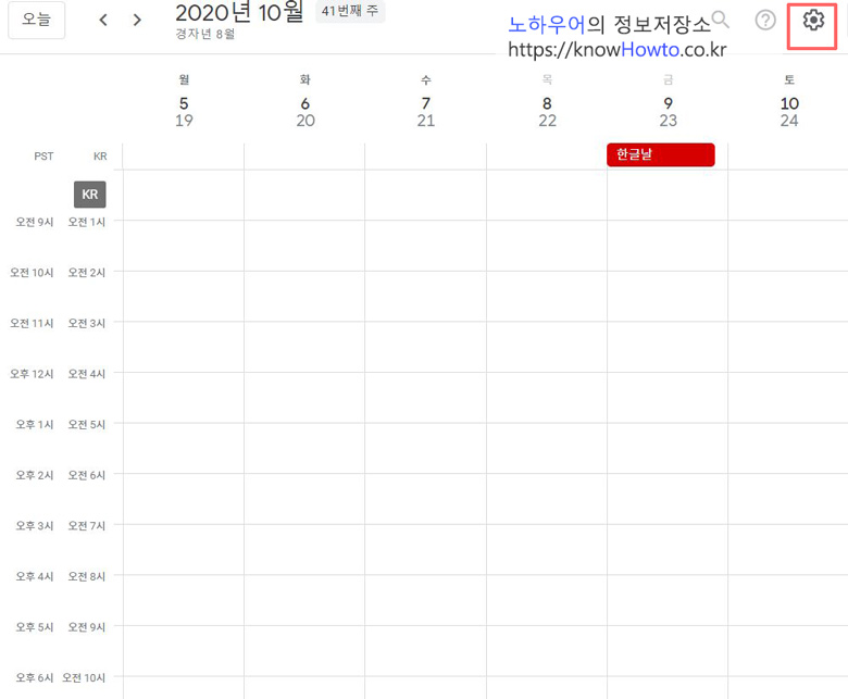 구글캘린더 화면에서 우측 상단에 있는 톱니바퀴모양의 '설정' 아이콘을 클릭합니다.