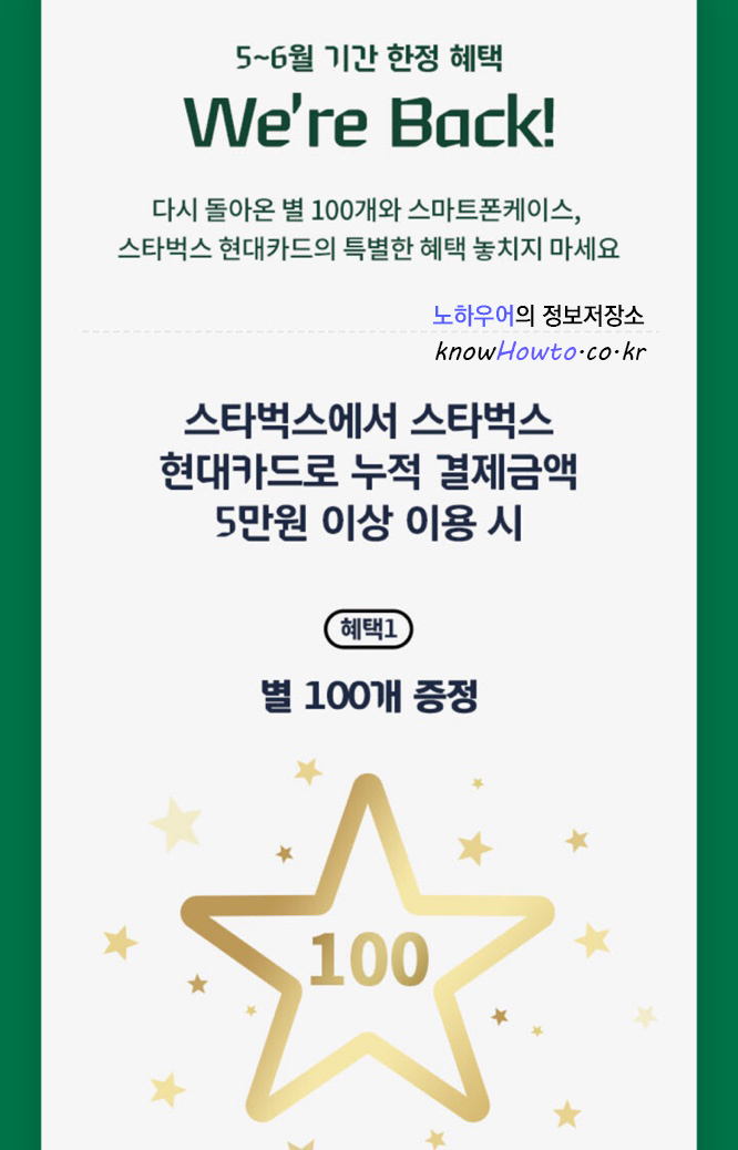 여기에 추가로 스벅 현대카드를 발급하면 스타벅스 별 100개를 주는 이벤트도 있습니다. (아래 사진 참고)