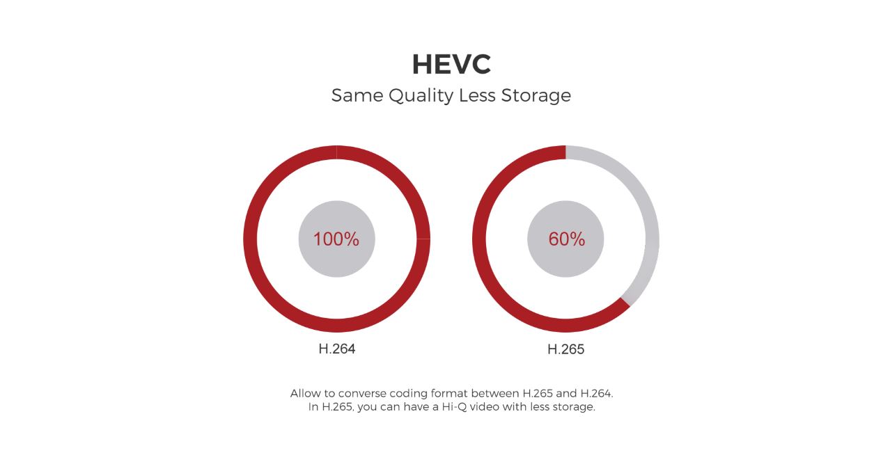HEVC 는 비디오 저장 포맷입니다. 범용적으로 사용되는 H.264 포맷 대비 용량을 40% 가량 줄여주어