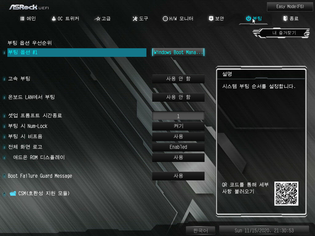 부팅순서는 아래 설정화면에서 수정, 변경이 가능합니다.