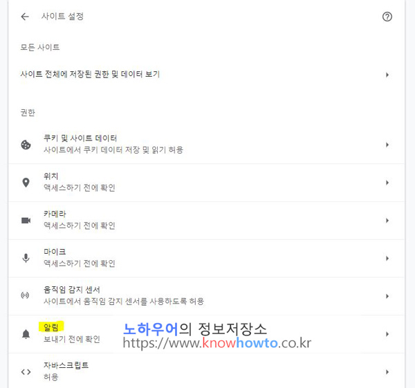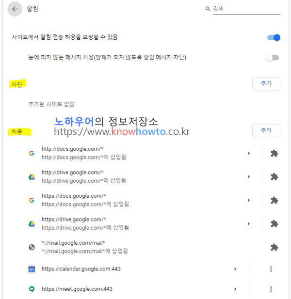 5. 위에서 눈치 채셨을 수도 있는데, 여기에서 내가 알림을 '허용'한 웹사이트 목록을 보실 수 있습니다.