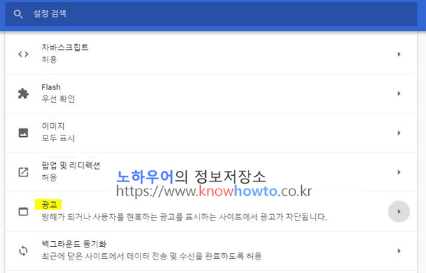 위에서 이미 찾았던 '사이트 설정' 메뉴 아래에 '알림'도 있지만 '광고'도 있습니다.