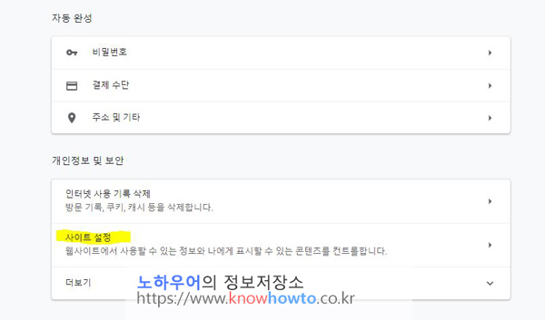 2. '개인정보 및 보안' 아래에서 '사이트 설정' 메뉴를 클릭합니다.