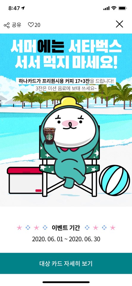 하나카드에서 신규 카드고객을 위해 5월부터 꾸준히 스타벅스 20잔 무료 이벤트를 하고 있어요.
