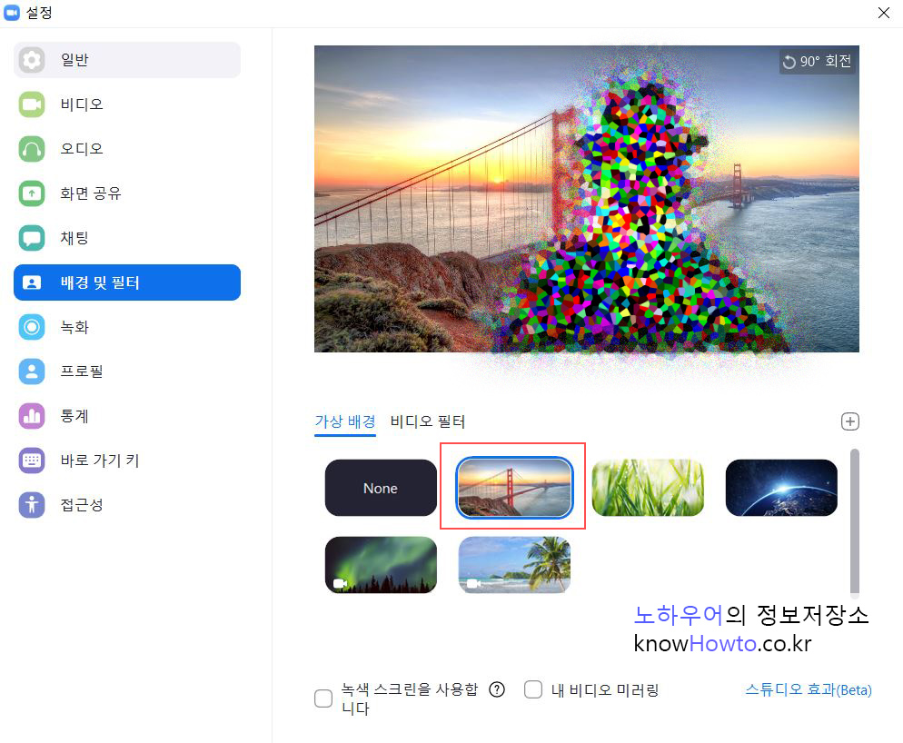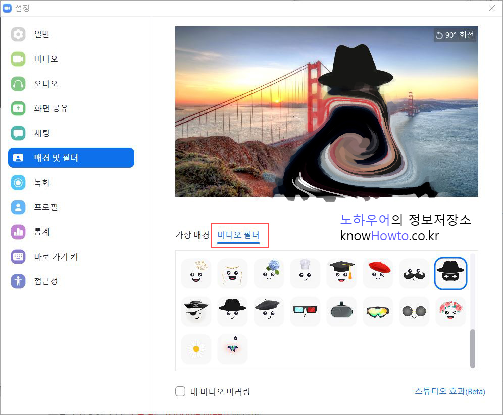 7. 내친김에 위 사진에 '가상배경' 옆에 보이는 '비디오 필터'도 적용해 봅니다.