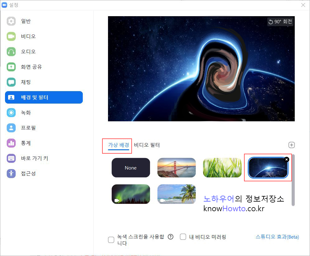 4. 설정 메뉴의 '배경 및 필터' 메뉴에서 '가상배경' 탭에 보면 선택할 수 있는 가상배경들이 보여집니다.