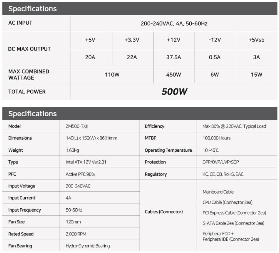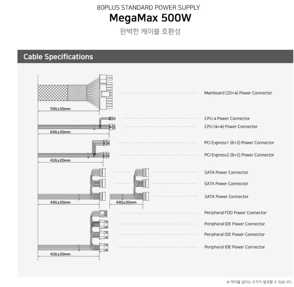 [ 잘만 MegaMax 500W 80plus Standard 파워 - 상세 스펙 ]