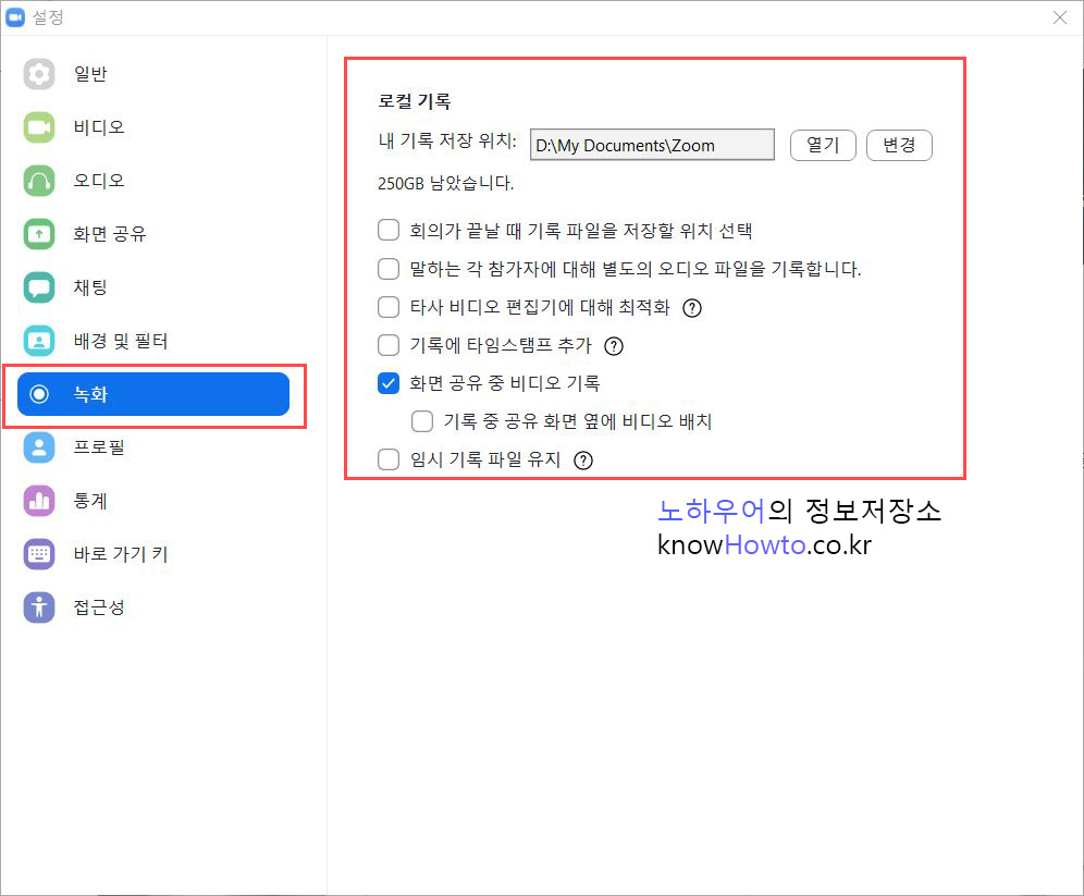 6. '화면 공유 중 비디오 기록'도 체크해 줍니다.