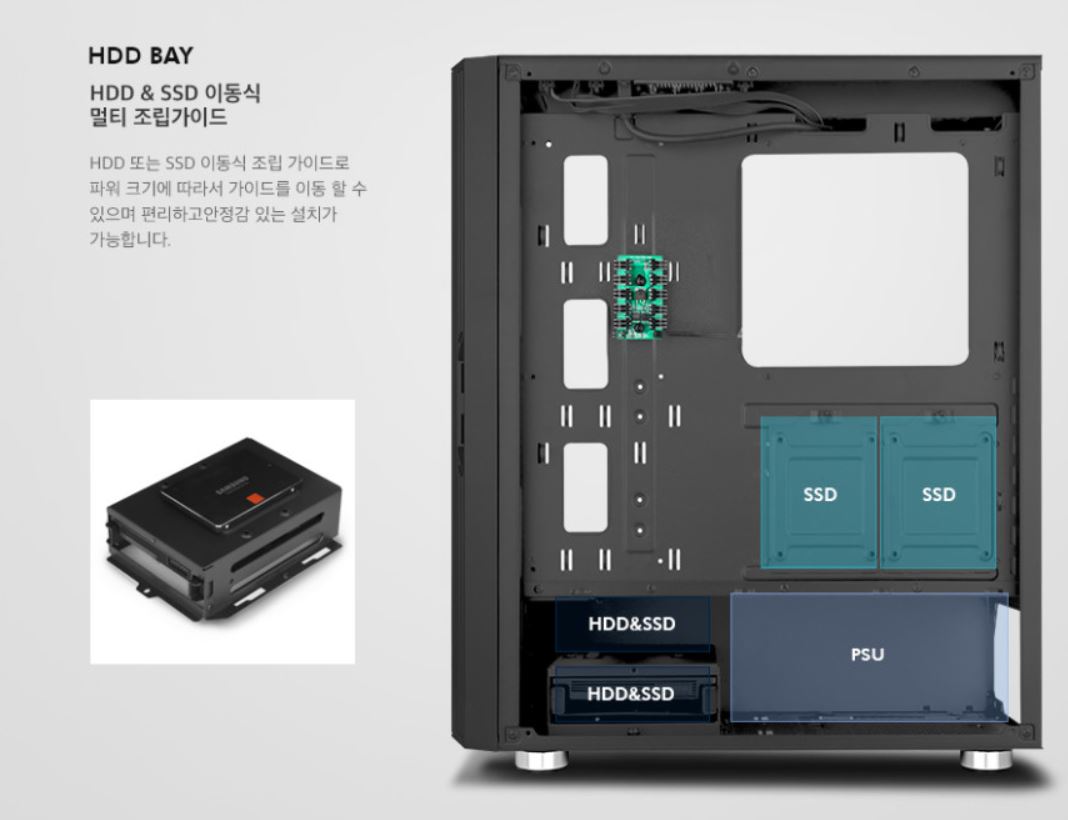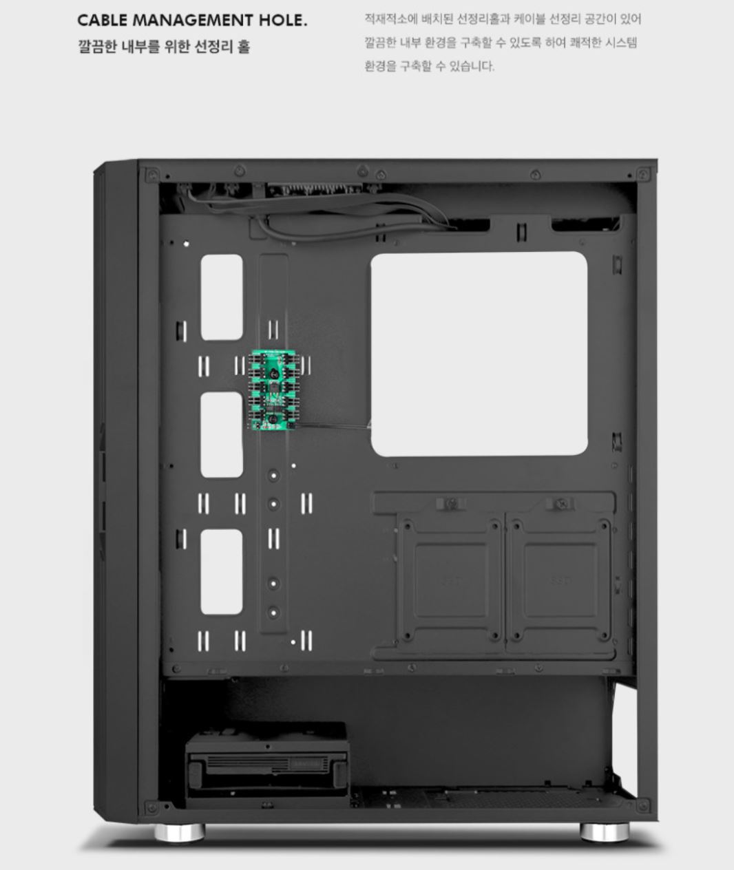케이스가 블랙이고 여기 저기 선 정리 홀이 많아서 쉽고 깔끔한 조립이 가능합니다.