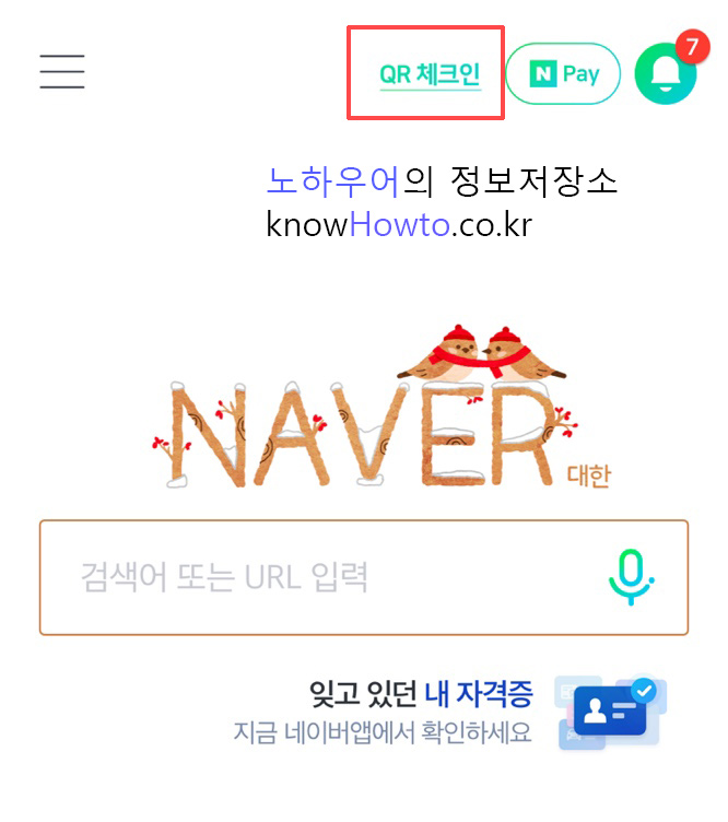7. 네이버 앱 메인에서 상단의 QR체크인을 클릭합니다.