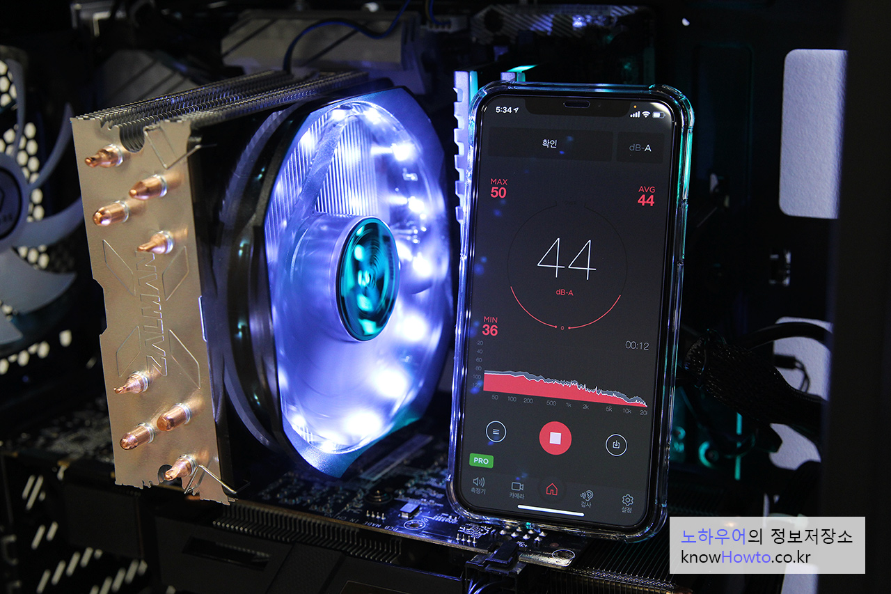 케이스 팬을 끄고 소음측정을 했는데 팬 바로 앞에 두니 44db가 측정되네요.