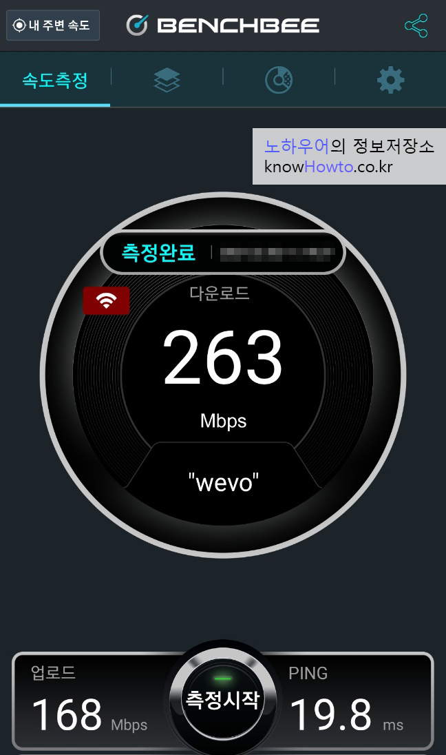 WiFi기준, 다운로드 263Mbps / 업로드 168Mbps 가 측정되었습니다.