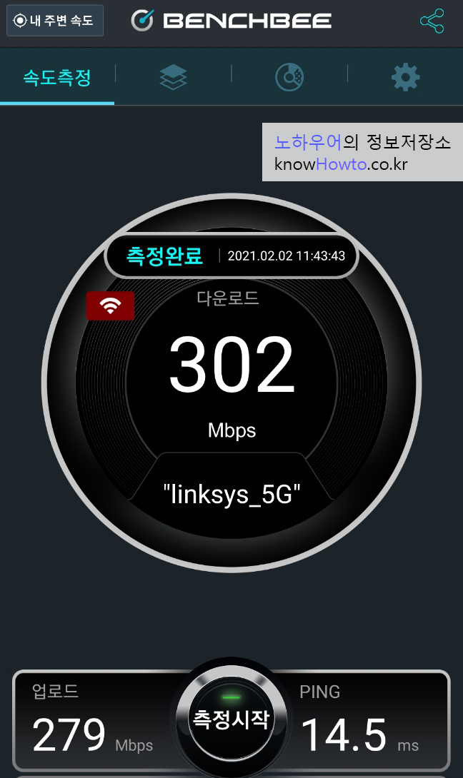 WiFi기준, 다운로드 302Mbps / 업로드 279Mbps 가 측정되었습니다.