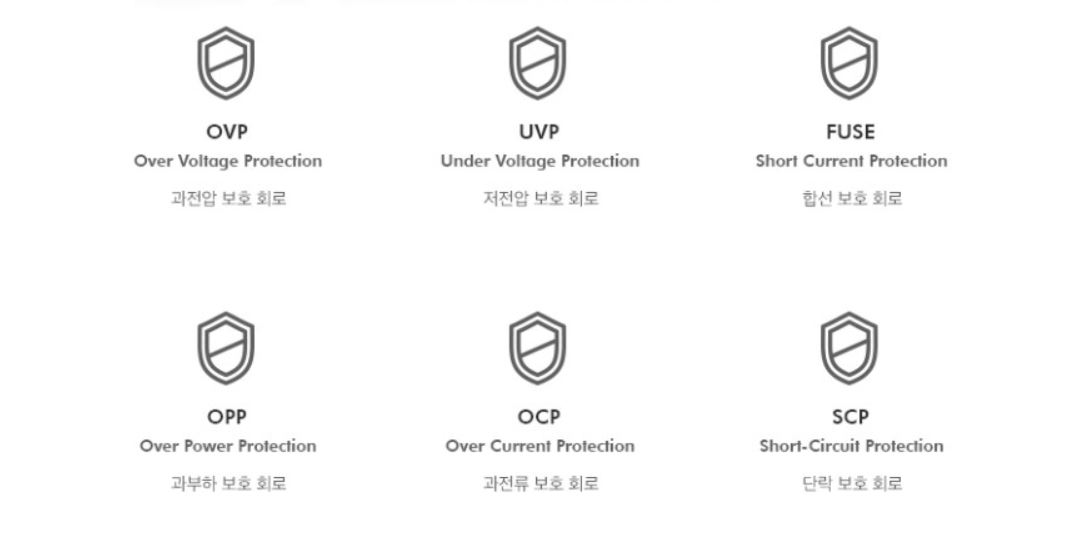 OVP, UVP, FUSE, OPP, OCP, SCP등 각종 보호회로 적용 역시 매우 만족스러운 부분입니다.