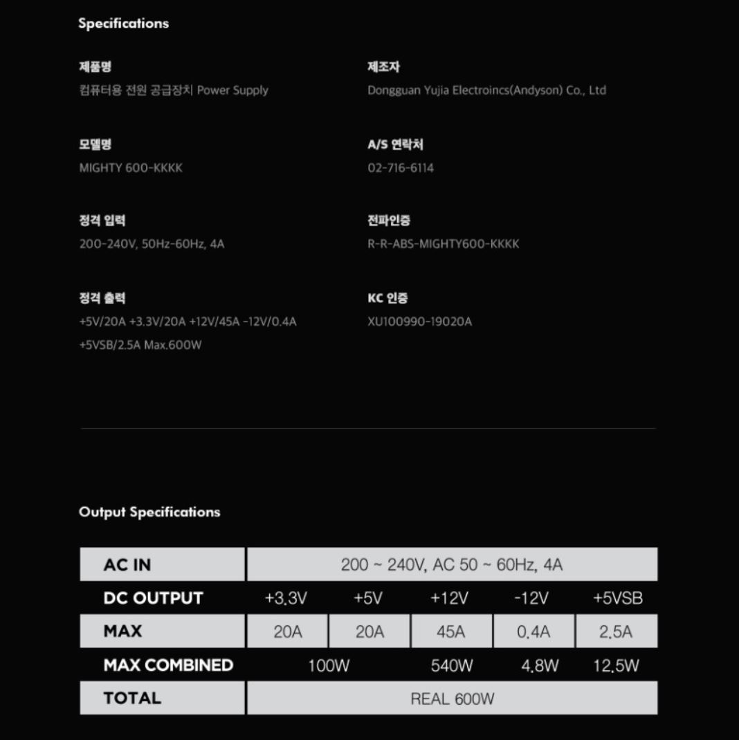 용량은 600W, 게다가 믿을 수 있는 80plus 인증, 그리고 4만원대 가격!