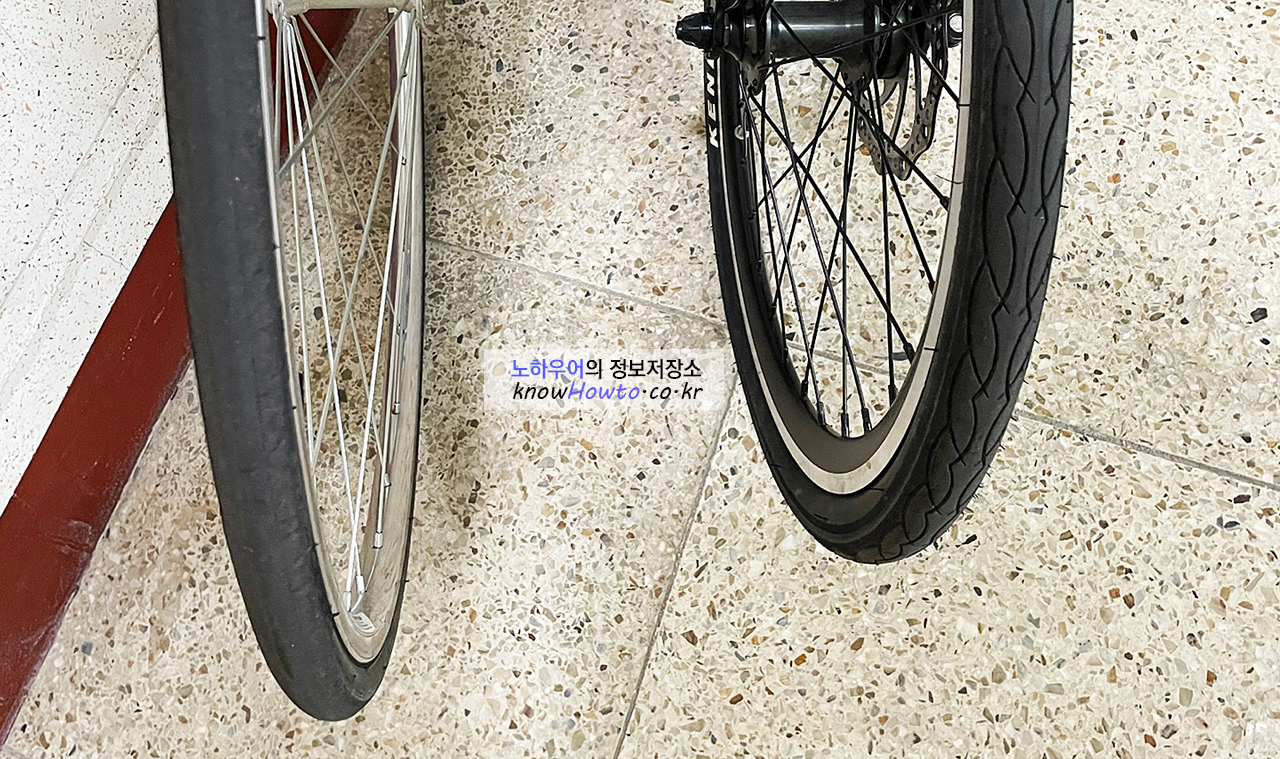 제가 타던 하이브리드 자전거와 타이어 두께 비교입니다.