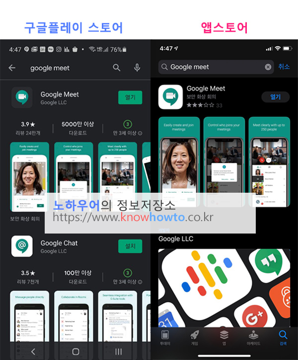 구글플레이 스토어나 앱스토어에서 Google Meet (구글 미트) 로 검색을 하면 됩니다.
