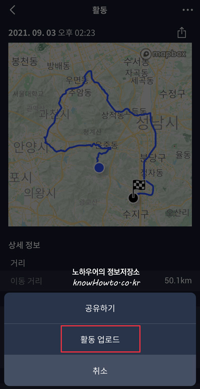 우리는 스트라바 업로드를 해야 하므로 '활동 업로드'를 클릭합니다.
