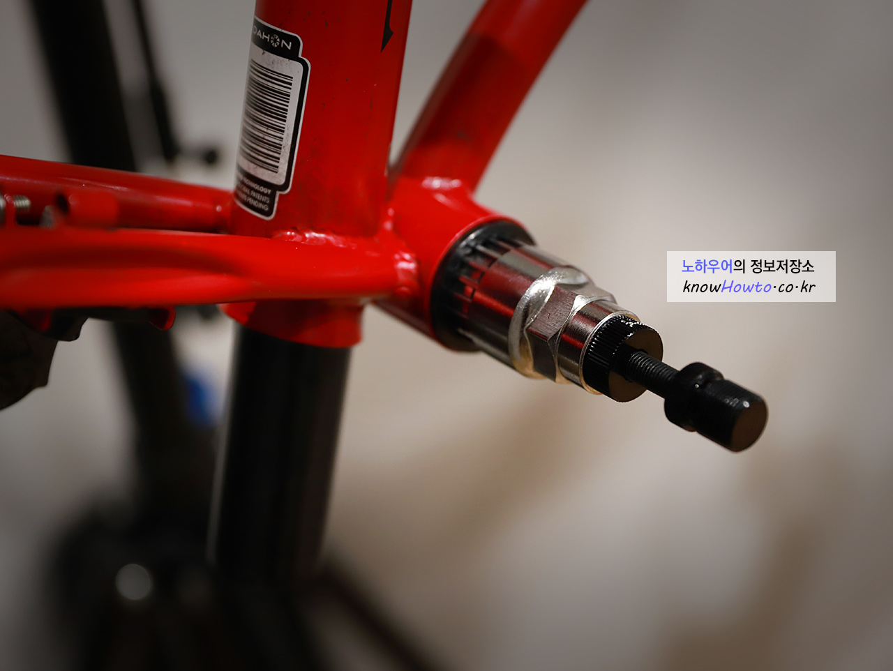 4. 그 다음 아래와 같은 크랭크 제거 툴을 크랭크우측 가운데 구멍에 돌려 끼워넣습니다.